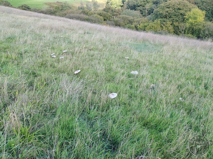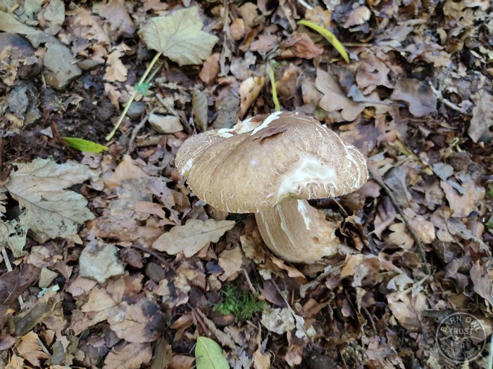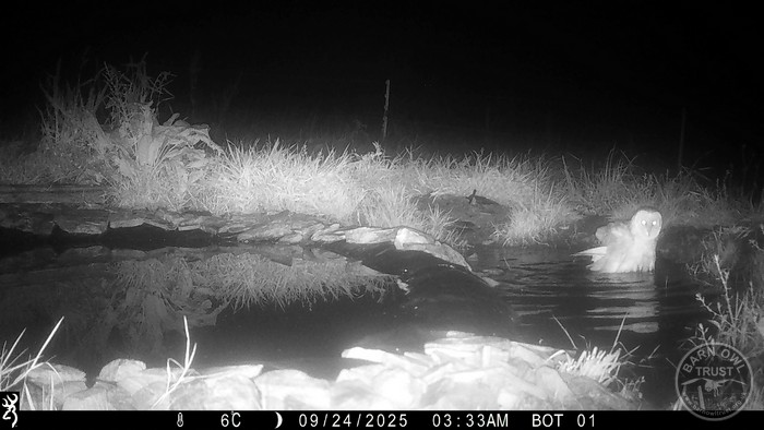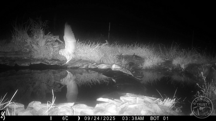 The 3 young Barn Owls were spotted roosting away from the Polebox in an ivy-clad tree in the remnant hedge at 15:00 on the 26th. On the 27th, the trail camera on the Swallow Pond picked up a Barn Owl bathing on the edge. Fly Agaric fungi (Amanita muscaria) had appeared along the Apprentice Path by the 28th, with Penny Bun (Boletus edulis) on the path in Corner Wood and Parasols (Macrolepiota procera) in profusion in the rough grassland above the Polebox in the Main Field. A small flock of 8 Skylarks were around the old crop on the 29th, a flock of 250+ Linnets and Goldfinches were seen in the crops and Pennsland Lane Hedge. A dozen Blackbirds were around the Solar Panels and a Green Woodpecker was heard.